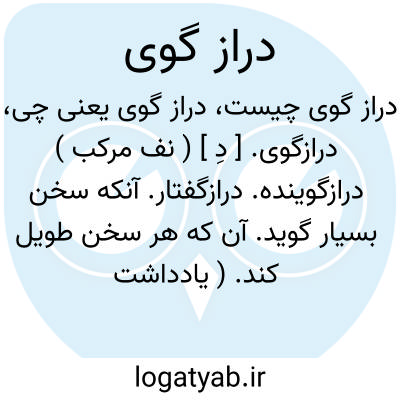 درازگوی. [ دِ ] ( نف مرکب ) درازگوینده. درازگفتار. آنکه سخن بسیار گوید. آن که هر سخن طویل کند. ( یادداشت مرحوم دهخدا ).