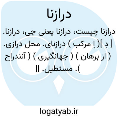 درازنا. [ دِ ]( اِ مرکب ) درازنای. محل درازی. ( از برهان ) ( جهانگیری ) ( آنندراج ). مستطیل. || درازا. طول. درازی. ( ناظم الاطباء ): فوت؛ بالای میان هر دو انگشت به درازنا. ( السامی فی الاسامی ). و رجوع به درازنای شود.