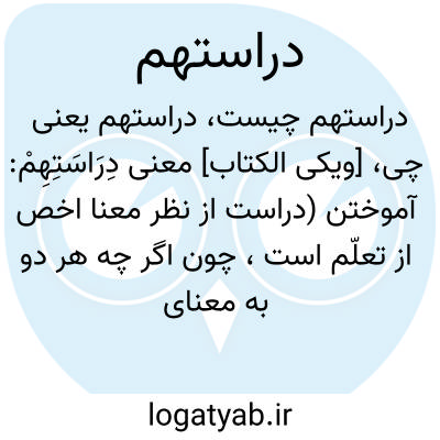 [ویکی الکتاب] معنی دِرَاسَتِهِمْ: آموختن (دراست از نظر معنا اخص از تعلّم است، چون اگر چه هر دو به معنای آموختن است، ولی دراست غالبا در جائی بکار میرود که انسان از روی کتاب درسی را بگیرد و بخواند تا بیاموزد. )