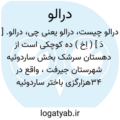 درالو. [ دَ ] ( اِخ ) ده کوچکی است از دهستان سرشک بخش ساردوئیه شهرستان جیرفت، واقع در 34هزارگزی باختر ساردوئیه و 10هزارگزی شمال راه مالرو بافت به ساردوئیه. ( از فرهنگ جغرافیایی ایران ج 8 ).