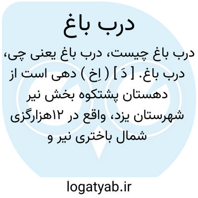 درب باغ. [ دَ ] ( اِخ ) دهی است از دهستان پشتکوه بخش نیر شهرستان یزد، واقع در 12هزارگزی شمال باختری نیر و 10 هزارگزی راه نیر به ابرقو، با 214 تن سکنه. آب آن از قنات و راه آن مالرو است. ( از فرهنگ جغرافیایی ایران ج 10 ).