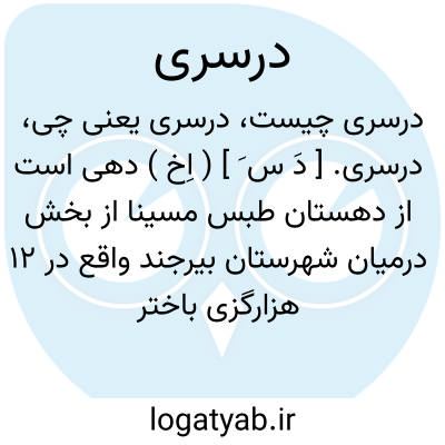 درسری. [ دَ س َ ] ( اِخ ) دهی است از دهستان طبس مسینا از بخش درمیان شهرستان بیرجند واقع در 12 هزارگزی باختر درمیان و 8 هزارگزی جنوب راه شوسه بیرجند به درح. ( از فرهنگ جغرافیایی ایران ج 9 ).