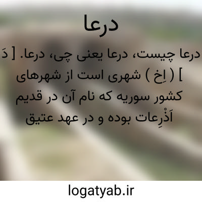 درعا. [ دَ ] ( اِخ ) شهری است از شهرهای کشور سوریه که نام آن در قدیم اَذْرِعات بوده و در عهد عتیق بصورت اِذْرَعی یااِدْرَعی آمده است. این شهر که 6500 تن جمعیت دارد در جنوب غربی سوریه و در 106 کیلومتری جنوب دمشق و نزدیک مرز اردن قرار گرفته است. در سال 613 یا 614 م.ایرانیان در ضمن جنگهای خود با دولت روم شرقی آنجا را تاراج و ویران کردند. ( از دائرةالمعارف فارسی ).