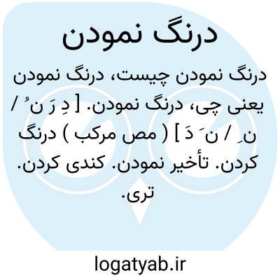 درنگ نمودن. [ دِ رَ ن ُ / ن ِ / ن َ دَ ] ( مص مرکب ) درنگ کردن. تأخیر نمودن. کندی کردن. تری. تعریش. تفخذ. تهنید. مُعارّة. ( منتهی الارب ): تعجس؛ درنگ نمودن و بازایستادن. تقطی؛ درنگ و تأخیر نمودن. مداومة؛ همیشه داشتن چیزی را و درنگ نمودن در آن. ( از منتهی الارب ).