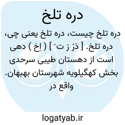 دره تلخ. [ دَرْ رَ ت َ ] ( اِخ ) دهی است از دهستان طیبی سرحدی بخش کهگیلویه شهرستان بهبهان. واقع در 9هزارگزی جنوب خاوری قلعه رئیسی مرکز دهستان. آب آن از چشمه و راه آن مالرو است. ساکنین آن از طایفه طیبی هستند. ( از فرهنگ جغرافیایی ایران ج 6 ).