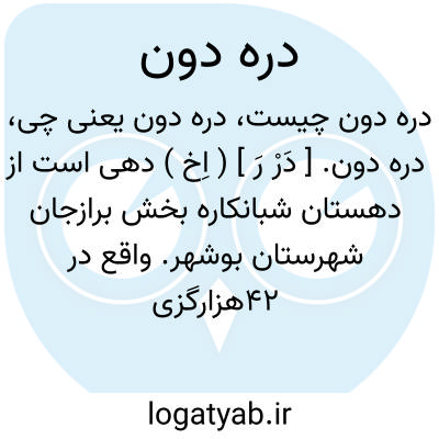 دره دون. [ دَرْ رَ ] ( اِخ ) دهی است از دهستان شبانکاره بخش برازجان شهرستان بوشهر. واقع در 42هزارگزی باختر برازجان و کنار رودخانه شور با 150 تن سکنه. آب آن از چاه وراه آن فرعی است. ( از فرهنگ جغرافیایی ایران ج 7 ).