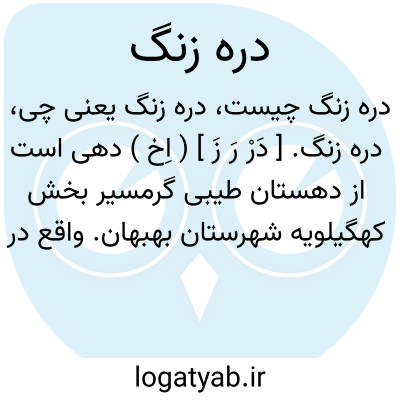 دره زنگ. [ دَرْ رَ زَ ] ( اِخ ) دهی است از دهستان طیبی گرمسیر بخش کهگیلویه شهرستان بهبهان. واقع در 6هزارگزی جنوب باختری لنده مرکز دهستان و 70 هزارگزی شمال راه شوسه بهبهان به آغاجاری، با 130 تن سکنه. آب آن از چشمه و رودخانه و راه آن مالرو است. ساکنین آن از طایفه طیبی هستند. ( از فرهنگ جغرافیایی ایران ج 6 ).