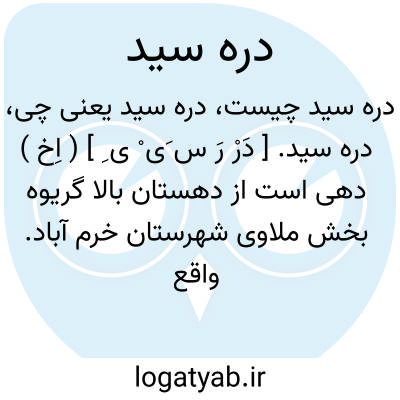 دره سید. [ دَرْ رَ س َی ْ ی ِ ] ( اِخ ) دهی است از دهستان بالا گریوه بخش ملاوی شهرستان خرم آباد. واقع در 52هزارگزی خاور راه شوسه خرم آباد به اندیمشک، با 300 تن سکنه. آب آن از چشمه بیدبهشت و راه آن مالرو است. بنای بقعه ای بنام دره سید دارد که از آثار قدیم است. و ساکنین آن از طایفه شلووند و چادرنشین هستند. ( از فرهنگ جغرافیایی ایران ج 6 ).