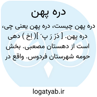 دره پهن. [ دَرْ رَ پ َ ]( اِخ ) دهی است از دهستان مصعبی. بخش حومه شهرستان فردوس. واقع در 32هزارگزی خاور فردوس و 6هزارگزی شمال راه مالرو عمومی نوغاب به فردوس. آب آن از قنات و راه آن مالرو است. ( از فرهنگ جغرافیایی ایران ج 9 ).