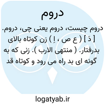 دروم. [ دَ ] ( ع ص، اِ ) زن کوتاه بالای بدرفتار. ( منتهی الارب ). زنی که به گونه ای بد راه می رود و کوتاه قد و کوچک است. ( از اقرب الموارد ). || زنی که به شب آمد و شد کند. ( از منتهی الارب ) ( از اقرب الموارد ).