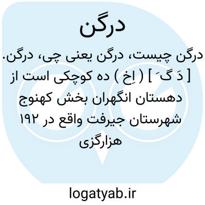 درگن. [ دَ گ َ ] ( اِخ ) ده کوچکی است از دهستان انگهران بخش کهنوج شهرستان جیرفت واقع در 192 هزارگزی جنوب کهنوج و سر راه مالرو میناب به انگهران. ( از فرهنگ جغرافیایی ایران ج 8 ).