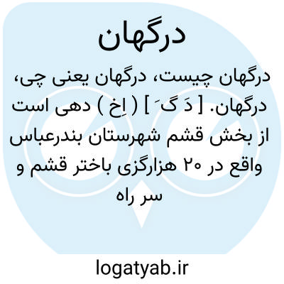 درگهان. [ دَ گ َ ] ( اِخ ) دهی است از بخش قشم شهرستان بندرعباس واقع در 20 هزارگزی باختر قشم و سر راه مالرو قشم به باسعیدو، با 1271 تن سکنه ( سرشماری سال 1335 هَ. ش. ). آب آن از چاه و باران و راه آن مالرو است. گمرک و گارد مسلح و پاسگاه ژاندارمری دارد. ( از فرهنگ جغرافیایی ایران ج 8 ).