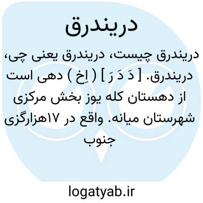 دریندرق. [ دَ دَ رَ ] ( اِخ ) دهی است از دهستان کله یوز بخش مرکزی شهرستان میانه. واقع در 17هزارگزی جنوب باختری میانه و 17هزارگزی راه شوسه تبریز به میانه، با 283 تن سکنه. آب آن از چشمه و راه آن مالرو است. ( از فرهنگ جغرافیایی ایران ج 4 ).