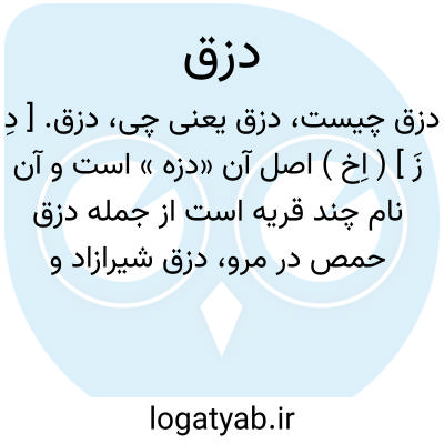 دزق. [ دِ زَ ] ( اِخ ) اصل آن «دزه » است و آن نام چند قریه است از جمله دزق حمص در مرو، دزق شیرازاد و دزق باران و دزق مسکین همگی در مرو شاهجان، و دزق علیا در مروالرود، و دزق سفلی از قرای «پنج ده ». و نیز دزق نام قریه بزرگی است برراه شاش در ماوراءالنهر مابین زامین و سمرقند، که به همگی اینها برخی از اشخاص نسبت دارند. ( از معجم البلدان ). و رجوع به الانساب سمعانی و منتهی الارب شود. دزق. [ دِ ] ( اِخ ) دهی است از دهستان سرولایت بخش سرولایت، شهرستان نیشابور. واقع در 12هزارگزی غرب چکنه بالا، با 871 تن سکنه. آب آن از قنات و راه آن مالرو است. ( از فرهنگ جغرافیایی ایران ج 9 ).