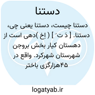 دستنا. [ دَ ت َ ] ( اِخ )دهی است از دهستان کیار بخش بروجن شهرستان شهرکرد. واقع در 45هزارگزی باختر بروجن و 3هزارگزی راه شلمزار به شهرکرد، با 2287 تن سکنه. آب آن از رودخانه و قنات و راه آن ماشین رو است و در حدود 15 باب دکان و قلعه قدیمی دارد. ( از فرهنگ جغرافیائی ایران ج 10 ).