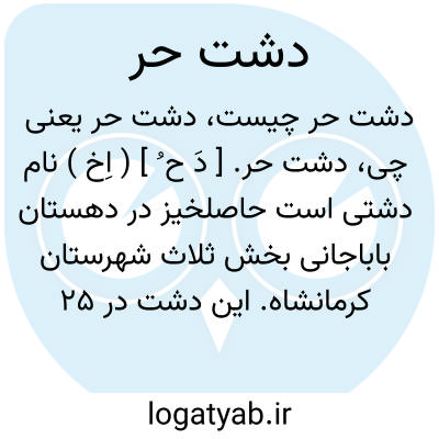 دشت حر. [ دَ ح ُ ] ( اِخ ) نام دشتی است حاصلخیز در دهستان باباجانی بخش ثلاث شهرستان کرمانشاه. این دشت در 25 هزارگزی جنوب شرقی ده شیخ واقع شده است و زارعین قرای انجیر لوسه، سه تیان، وانی سر، زیارت تمرمان، برکش، کانی دانیار، قلقله، قجبر و گریشه در این دشت زراعت دیم مینمایند. ( از فرهنگ جغرافیایی ایران ج 5 ).