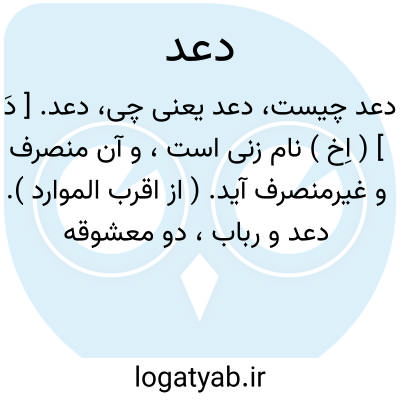 دعد. [ دَ ] ( اِخ ) نام زنی است، و آن منصرف و غیرمنصرف آید. ( از اقرب الموارد ). دعد و رباب، دو معشوقه مثلی عرب یا عاشق و معشوقه ای از آنان.( امثال و حکم دهخدا ). یکی از زنان معروف عرب. در ادب فارسی وی را عاشق، و رباب را ( که آن هم اسم زنی بوده ) معشوق پنداشته اند. در الفهرست ابن الندیم ( ص 306 و 307 ) در جزو کتب اسمار و خرافات و داستان عشاق عرب «کتاب الرباب و زوجها اللذین تعاهدا» و «کتاب عامر و دعد جاریة خالصة» آمده است. معذلک نام «کتاب دعد والرباب » که هم ابن الندیم تحت عنوان «اسماء عشاق الانس للجن و عشاق الجن للانس » ذکر نموده این ظن را در خاطر تولید می کند که شاید اشاره شعرای ایران به این عاشق و معشوق باشد. ( از فرهنگ فارسی معین، از تعلیقات مجتبی مینوی بر دیوان ناصرخسرو ص 625 ):