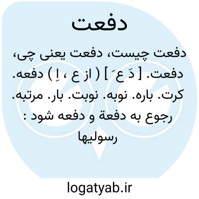 دفعت. [ دَ ع َ ] ( از ع، اِ ) دفعه. کرت. باره. نوبه. نوبت. بار. مرتبه. رجوع به دفعة و دفعه شود: رسولیها کرده بود به دو دفعت و به بغداد رفته. ( تاریخ بیهقی چ ادیب ص 363 ). بچند دفعت خواستند که برسولیها برود و حیلت کردتا از وی درگذشتی [ اموی ]. ( تاریخ بیهقی ص 255 ).