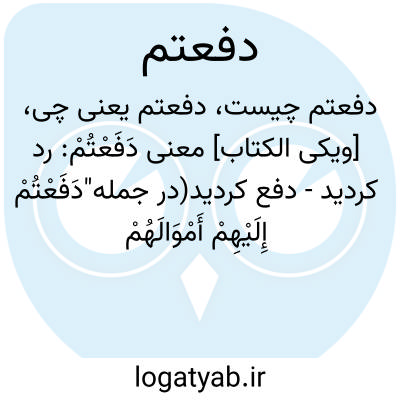 [ویکی الکتاب] معنی دَفَعْتُمْ: رد کردید - دفع کردید(در جمله"دَفَعْتُمْ إِلَیْهِمْ أَمْوَالَهُمْ "یعنی اموالشان را به آنها برگرداندید) ریشه کلمه: دفع (۱۰ بار)