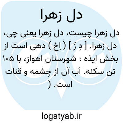 دل زهرا. [ دِ زَ ] ( اِخ ) دهی است از بخش ایذه، شهرستان اهواز، با 105 تن سکنه. آب آن از چشمه و قنات است. ( از فرهنگ جغرافیایی ایران ج 6 ).
