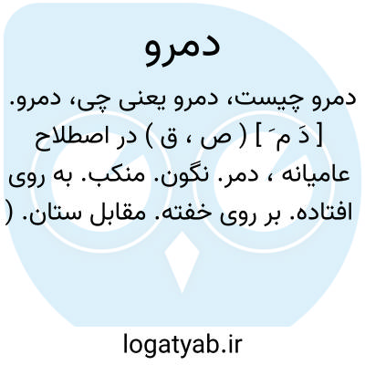 دمرو. [ دَ م َ ] ( ص، ق ) در اصطلاح عامیانه، دمر. نگون. منکب. به روی افتاده. بر روی خفته. مقابل ستان. ( یادداشت مؤلف ). مقابل طاقباز. به روی افتاده و پیشانی بر زمین نهاده و دمر خوابیده. ضد ستان خوابیده. ( ناظم الاطباء ). رجوع به دمر شود. || حالت وارون بر زمین نهادگی ظرفی یا کتابی و امثال آن، چنانکه لب کاسه یا جام یا پیاله ای را بر زمین نهند به جای ته و پایه آن. ( یادداشت مؤلف ). و رجوع به دمر شود.