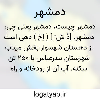دمشهر. [دُ ش َ ] ( اِخ ) دهی است از دهستان شهسوار بخش میناب شهرستان بندرعباس با 250 تن سکنه. آب آن از رودخانه و راه آن اتومبیل رو است. مزارع بلندی، گردان، دهیران جزء این ده است. ( از فرهنگ جغرافیایی ایران ج 8 ).