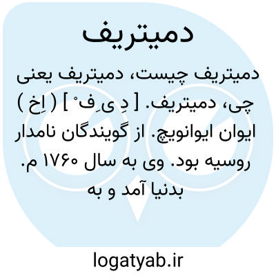 دمیتریف. [ دِ ی ِف ْ ] ( اِخ ) ایوان ایوانویچ. از گویندگان نامدار روسیه بود. وی به سال 1760 م. بدنیا آمد و به سال 1837 م. درگذشت. او در اول به خدمت ارتش درآمد و بعدها به مقام دادستانی و نظارت عدلیه رسید. امثال و داستانهای منظوم و اشعاری دیگر از او بر جای مانده است. ( از قاموس الاعلام ترکی ).