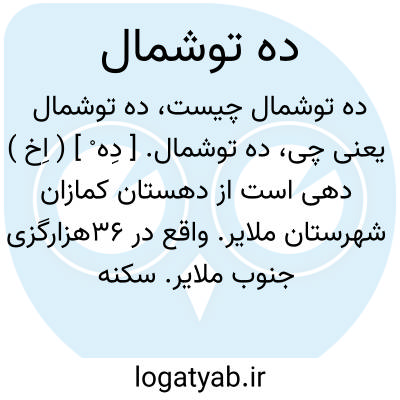 ده توشمال. [ دِه ْ ] ( اِخ ) دهی است از دهستان کمازان شهرستان ملایر. واقع در 36هزارگزی جنوب ملایر. سکنه 357 تن. ( از فرهنگ جغرافیایی ایران ج 5 ).
