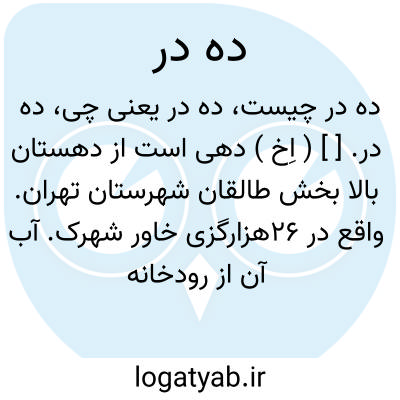 ده در. [ ] ( اِخ ) دهی است از دهستان بالا بخش طالقان شهرستان تهران. واقع در 26هزارگزی خاور شهرک. آب آن از رودخانه گندآب تأمین می شود.سکنه آن 200 تن. ( از فرهنگ جغرافیایی ایران ج 1 ).، دهدر. [ دُ دُرر ]( ع اِ ) اسم است مر دروغ و باطل را. ( منتهی الارب ).
