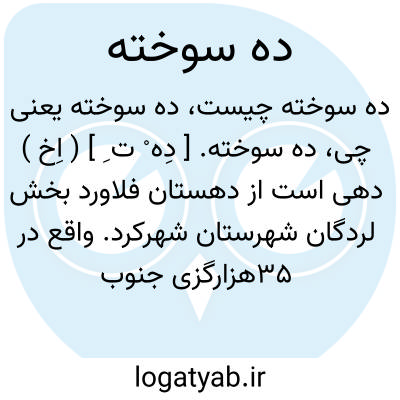 ده سوخته. [ دِه ْ ت ِ ] ( اِخ ) دهی است از دهستان فلاورد بخش لردگان شهرستان شهرکرد. واقع در 35هزارگزی جنوب لردگان. دارای 130تن سکنه است. آب آن از چشمه تأمین می شود. راه آن فرعی. ( از فرهنگ جغرافیایی ایران ج 10 ).