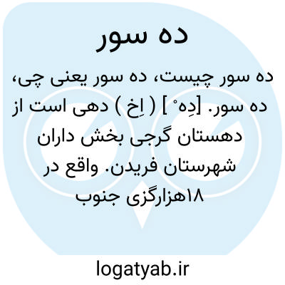 ده سور. [دِه ْ ] ( اِخ ) دهی است از دهستان گرجی بخش داران شهرستان فریدن. واقع در 18هزارگزی جنوب باختری داران. دارای 189 تن سکنه است. آب آن از رودخانه و قنات و چشمه تأمین می شود. ( از فرهنگ جغرافیایی ایران ج 10 ).