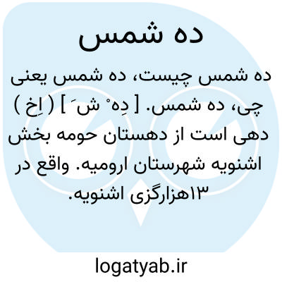 ده شمس. [ دِه ْ ش َ ] ( اِخ ) دهی است از دهستان حومه بخش اشنویه شهرستان ارومیه. واقع در 13هزارگزی اشنویه. آب آن از قادرچای تأمین می شود. سکنه آن 470 تن. راه آن اتومبیل رو. ( از فرهنگ جغرافیایی ایران ج 4 ).