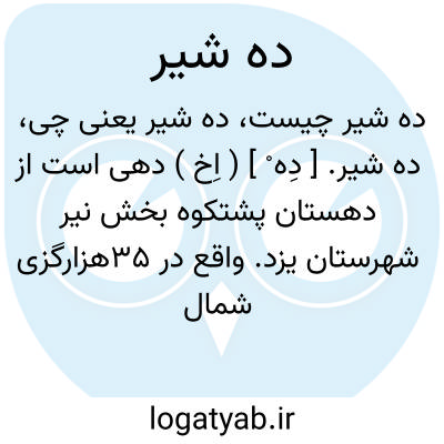 ده شیر. [ دِه ْ ] ( اِخ ) دهی است از دهستان پشتکوه بخش نیر شهرستان یزد. واقع در 35هزارگزی شمال باختری نیر. دارای 1046 تن سکنه می باشد. آب آن از قنات تأمین می شود. ( از فرهنگ جغرافیایی ایران ج 10 ).
