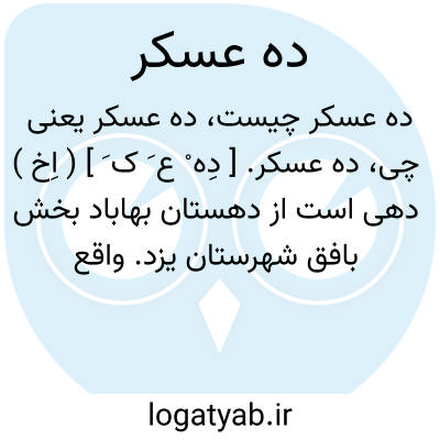 ده عسکر. [ دِه ْ ع َ ک َ ] ( اِخ ) دهی است از دهستان بهاباد بخش بافق شهرستان یزد. واقع در80هزارگزی شمال خاوری بافق دارای 188 تن سکنه می باشد. آب آن از قنات تأمین می شود. راه آن ماشین رو است. ( از فرهنگ جغرافیایی ایران ج 10 ).