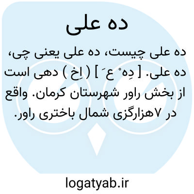 ده علی. [ دِه ْ ع َ ] ( اِخ ) دهی است از بخش راور شهرستان کرمان. واقع در 7هزارگزی شمال باختری راور. سکنه آن 480 تن. آب آن از قنات تأمین می شود. ( از فرهنگ جغرافیایی ایران ج 8 ).