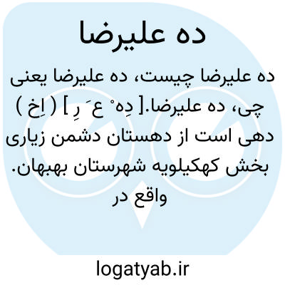 ده علیرضا.[ دِه ْ ع َ رِ ] ( اِخ ) دهی است از دهستان دشمن زیاری بخش کهکیلویه شهرستان بهبهان. واقع در 11هزارگزی شمال باختری قلعه کلات مرکز دهستان دارای 100 تن سکنه می باشد. آب آن از چشمه تأمین می شود. ساکنین از طایفه ٔدشمن زیاری هستند. ( از فرهنگ جغرافیایی ایران ج 6 ).