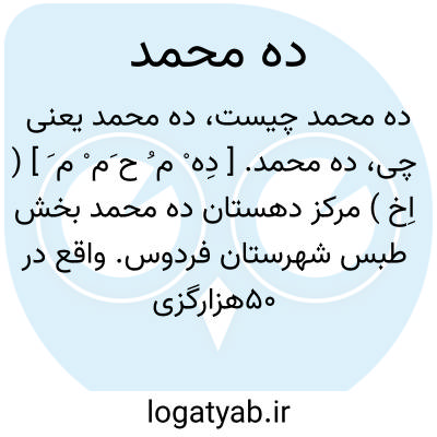 ده محمد. [ دِه ْ م ُ ح َم ْ م َ ] ( اِخ ) نام یکی ازدهستانهای بخش طبس شهرستان فردوس است که در شمال طبس واقع و اغلب قراء آن در خاور شوسه عمومی فردوس - طبس قرار دارند. و از 6 آبادی تشکیل شده و در حدود 508 تن جمعیت دارد. ( از فرهنگ جغرافیایی ایران ج 9 ).