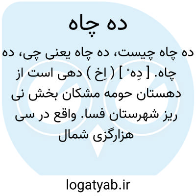 ده چاه. [ دِه ْ ] ( اِخ ) دهی است از دهستان حومه مشکان بخش نی ریز شهرستان فسا. واقع در سی هزارگزی شمال خاور نی ریز. سکنه آن 893 تن. آب آن از قنات تأمین می شود. ( از فرهنگ جغرافیایی ایران ج 7 ).