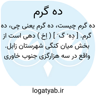 ده گرم. [ دِه ْ گ َ ] ( اِخ ) دهی است از بخش میان کنگی شهرستان زابل. واقع در سه هزارگزی جنوب خاوری ده دوست محمد نزدیک مرزافغانستان. سکنه آن 403 تن. آب آن از رودخانه هیرمند تأمین می شود. ( از فرهنگ جغرافیایی ایران ج 8 ).