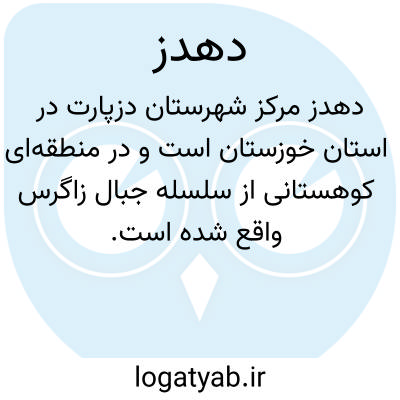 دهدز.[ دِ دِ ] ( اِخ ) قصبه مرکز بخش دهدز شهرستان اهوازدر 204هزارگزی شمال خاوری اهواز، دارای 300 تن سکنه است. آب آن از چشمه و قنات تأمین می شود. محصول: غلات، لبنیات و شغل اهالی زراعت و گله داریست. از ادارات دولتی بخشداری، شهرداری، پست، ژاندارمری، دبستان و 20 باب دکان دارد. ( از فرهنگ جغرافیایی ایران ج 6 ).