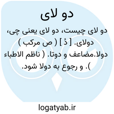 دولا. مضاعف و دوتا.، ( دولا ی ) ( صفت ) ۱ - دو تاه مضاعف: پارچه دولا ( که عرض آن بیش از پارچه معمولی است ). ۲ - خمیده منحنی. ۳ - سبوی آب و شراب. یا دولای پهنا پارچه ای که عرض آن دو برابر عزض پارچه های معمولی است. یا دولا پهنا حساب کردن بهای چیزی را دو برابر قیمت حقیقی محسوب کردن. توضیح: در تداول گویند.
