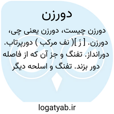 دورزن. [ زَ ]( نف مرکب ) دورپرتاب. دورانداز. تفنگ و جز آن که از فاصله دور بزند. تفنگ و اسلحه دیگر که از مسافت دور بر هدف اصابت کند. که پرتاب دور دارد: که تیررسی دور دارد؛ توپ دورزن؛ تفنگ دورزن. ( یادداشت مؤلف ).