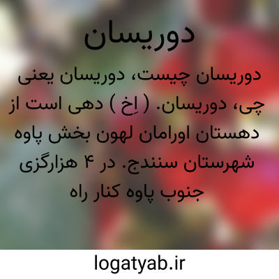 دوریسان. ( اِخ ) دهی است از دهستان اورامان لهون بخش پاوه شهرستان سنندج. در 4 هزارگزی جنوب پاوه کنار راه اتومبیل رو پاوه به روانسر. 375 تن سکنه. آب آن از چشمه و راه آن اتومبیل روست. ( از فرهنگ جغرافیایی ایران ج 5 ).
