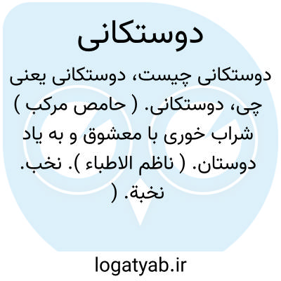 دوستکانی. ( حامص مرکب ) شراب خوری با معشوق و به یاد دوستان. ( ناظم الاطباء ). نخب. نخبة. ( منتهی الارب ). شرب به شادی دوست. دوستگانی. نوشیدن شراب به یاد دوستان. شادی خوردن. و در تداول امروزه گویند: به سلامتی تو یا به سلامتی فلان که غایب است می نوشم. ( یادداشت مؤلف ). || ( اِ مرکب ) پیاله و شرابی که با دوست خورند و یا از مجلس از برای او فرستند. ( انجمن آرا ) ( آنندراج ). || پیاله پر از شراب که کسی در نوبت خود از روی محبت و صدق و صفا به دیگری دهد. || پیاله ساغر. || مینای شراب و ظرف و آوند شراب. ( ناظم الاطباء ). رجوع به دوستگانی در همه معانی شود.