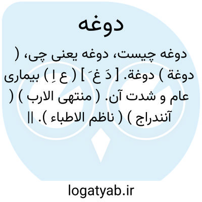 ( دوغة ) دوغة. [ دَ غ َ ] ( ع اِ ) بیماری عام و شدت آن. ( منتهی الارب ) ( آنندراج ) ( ناظم الاطباء ). || وبا. ( ناظم الاطباء ). || ( اِمص ) سردی. || گولی. || رعونت. ( منتهی الارب ) ( ناظم الاطباء ) ( آنندراج ).