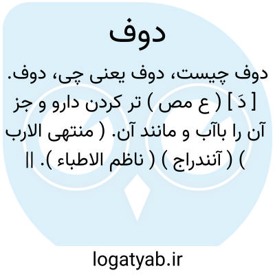 دوف. [ دَ ] ( ع مص ) تر کردن دارو و جز آن را باآب و مانند آن. ( منتهی الارب ) ( آنندراج ) ( ناظم الاطباء ). || آمیختن. ( منتهی الارب ) ( آنندراج ). آمیختن و مخلوط کردن چیزی را. || سودن و ترکردن مشک. ( ناظم الاطباء ). سودن دارو و مشک و جز آن و یا به چیزی دیگر تر کردن. ( تاج المصادر بیهقی ). بسودن و بگذرانیدن چیزی سخت در آب. ( المصادر زوزنی ).