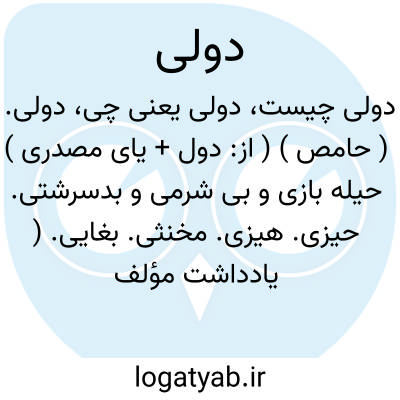 دولی. ( حامص ) ( از: دول + یای مصدری ) حیله بازی و بی شرمی و بدسرشتی. حیزی. هیزی. مخنثی. بغایی. ( یادداشت مؤلف ). دغابازی. ( شرفنامه منیری ). مکر و فریب. ( آنندراج ). فریب و مکر و حیله. ( ناظم الاطباء ):