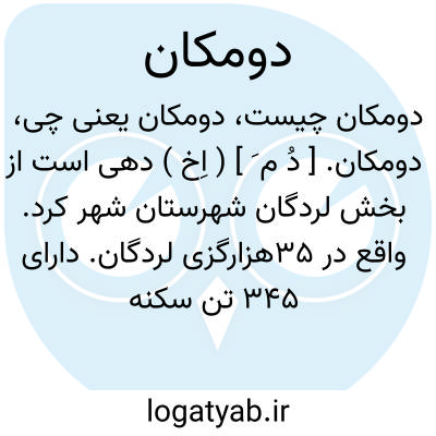 دومکان. [ دُ م َ ] ( اِخ ) دهی است از بخش لردگان شهرستان شهر کرد. واقع در 35هزارگزی لردگان. دارای 345 تن سکنه است. آب آن از چشمه است. ( از فرهنگ جغرافیایی ایران ج 10 ).