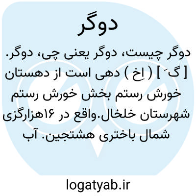 دوگر. [ گ َ ] ( اِخ ) دهی است از دهستان خورش رستم بخش خورش رستم شهرستان خلخال.واقع در 16هزارگزی شمال باختری هشتجین. آب آن از دورشته چشمه می باشد. ( از فرهنگ جغرافیایی ایران ج 4 ).