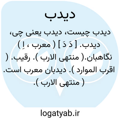دیدب. [ دَ دَ ] ( معرب، اِ ) نگاهبان.( منتهی الارب ). رقیب. ( اقرب الموارد ). دیدبان معرب است. ( منتهی الارب ). پاسبان. ناظر. ( ناظم الاطباء ). || طلیعه. ( اقرب الموارد ). طلایه سپاه. قدام العسکر. ( از تاج العروس ). ربیئة. ( اساس البلاغة ). || گورخر. ( منتهی الارب ) ( از اقرب الموارد ).